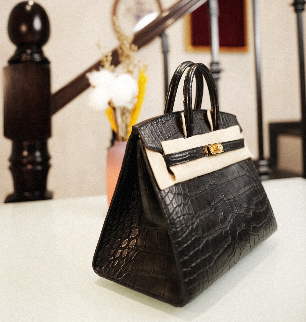 BIRKIN 20 CC89- Black gold buckle mist top Alligator square leather