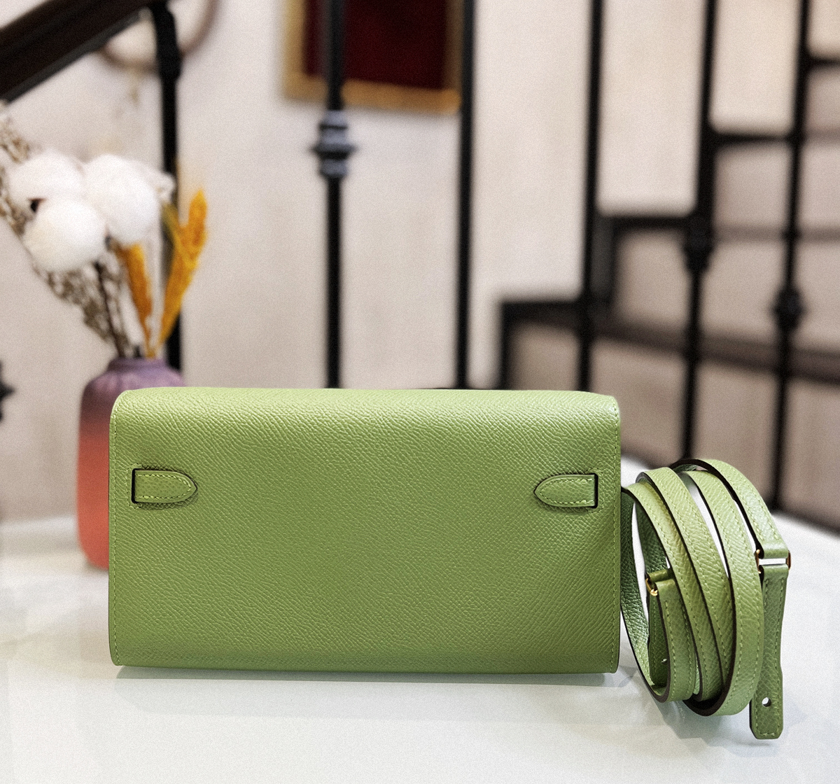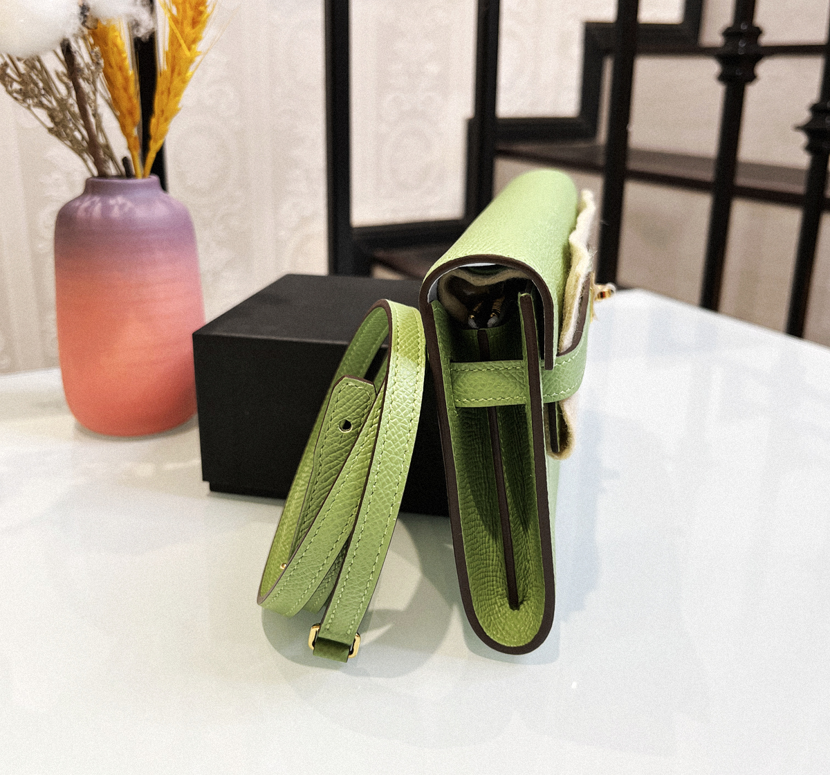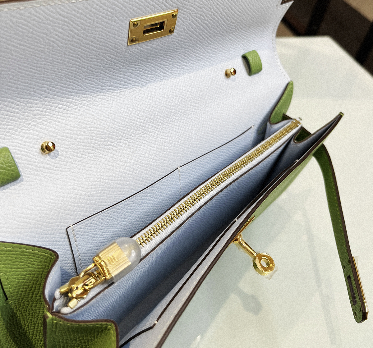 Hermes Kelly to go cc3i Avocado green interior T0 haze blue gold buckle Epsom