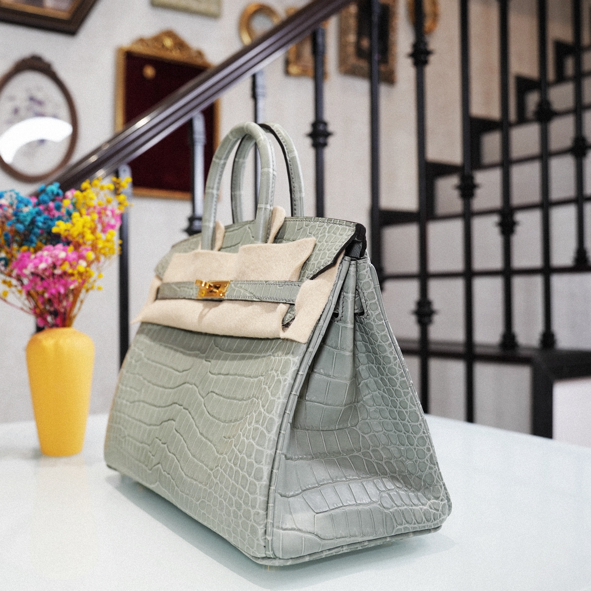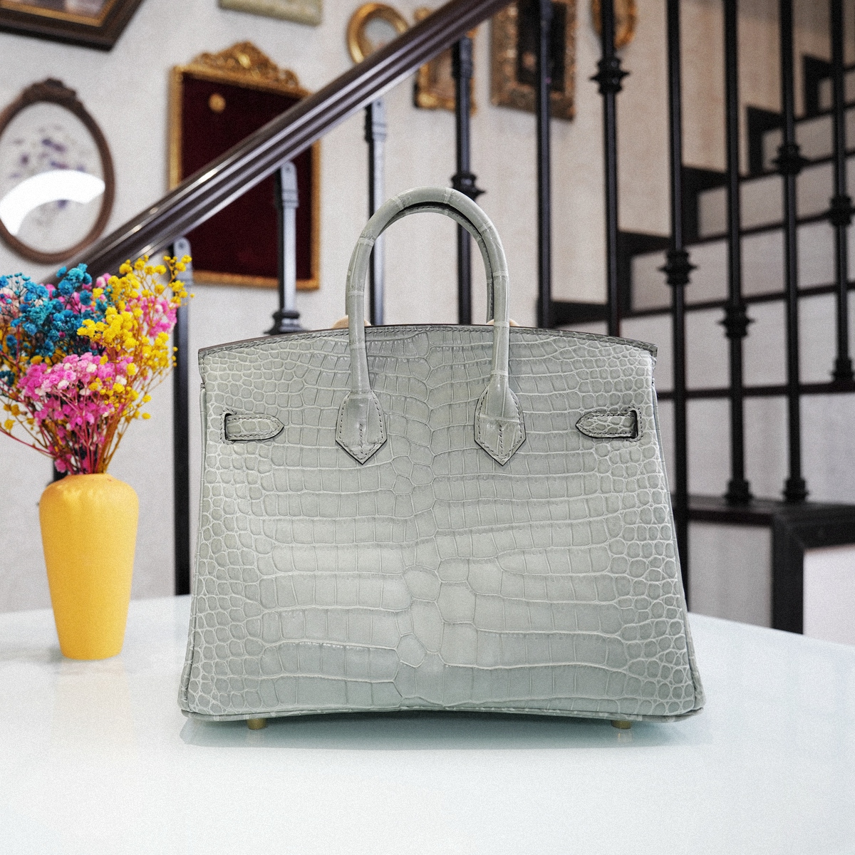 BIRKIN 25 CCOV- Cement ash inverted V mist top alligator skin
